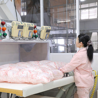 ⑥Inserting The refreshed feathers of the customer are passed through a double safety device and are accurately weighed and added one square at a time to the new side fabric.