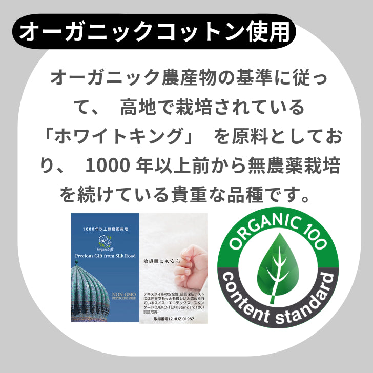 オーガニック農産物等の生産についての基準に従って、科学薬剤を使っていない農地での厳格な基準を守って育てられたコットンです。