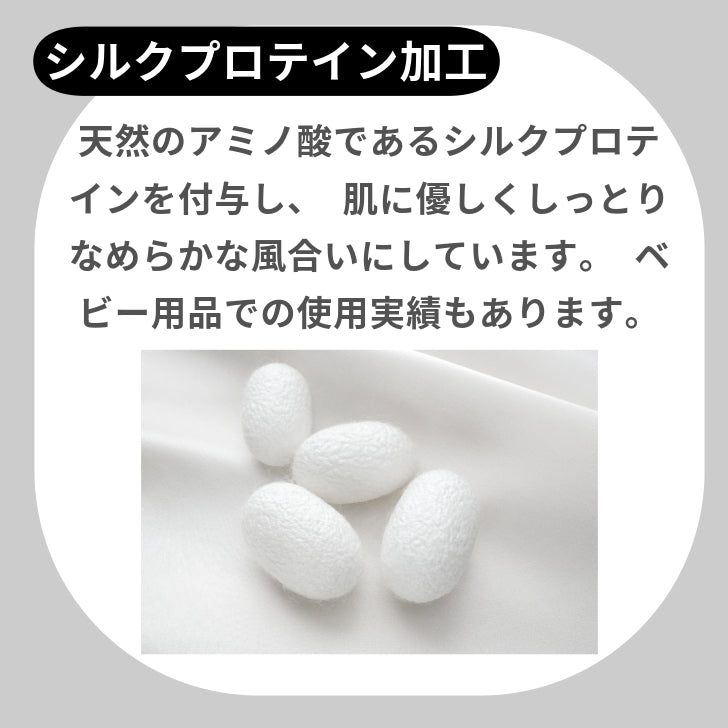 染色加工時に天然のアミノ酸であるシルクプロテイン付与し、肌に優しくしっとりなめらかな風合いにしています。ベビー用品での使用実績もあり、未加工品に比べて吸放出性も高く、臭いを抑える効果もあります。