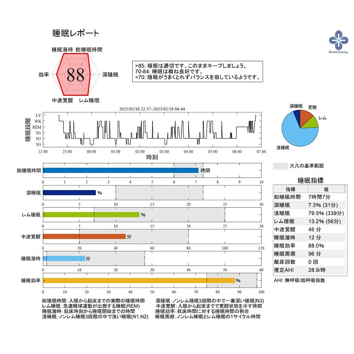 - ノンレム睡眠やレム睡眠・覚醒状態などの割合を可視化