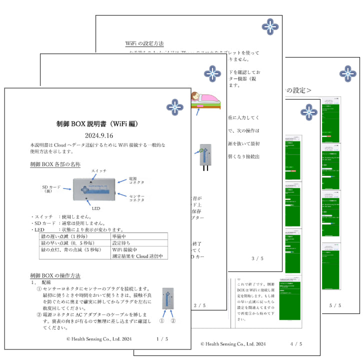 2,計測機器が届きましたら、取扱説明書をご確認いただきながらご自宅のWi-Fiへの接続設定をお手持ちのスマートフォン(iPhone、android)で行ってください。その後、普段寝ている寝具環境に設置をしてください。